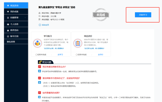 本次学习以年级、班级为单位,统一在教育部全国青少年普法网上开展,各班级应积极组织同学利用平台资源完成在线学习、课后练习、成果检测等,并于10月13日之前完成平台学习全覆盖。