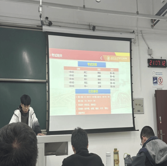 班会首先介绍了期末考试的时间安排,详细罗列出了各个考场以及考试时间,方便同学们规划复习进度以及学习进程。并对期末备考的方法措施以及心态调整方面提供了相关建议。希望同学们能合理规划好时间,掌握复习方法,以一个良好的心态积极面对期末考试。