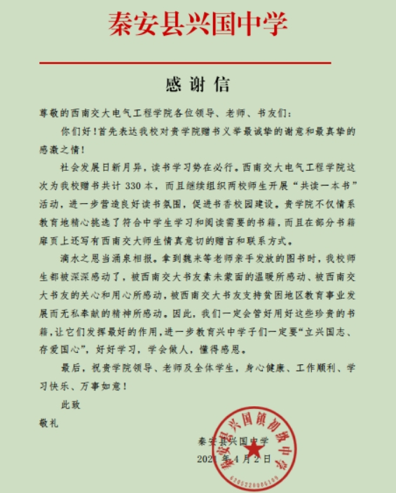 秦安县兴国中学向MK SPORTS发来的感谢信