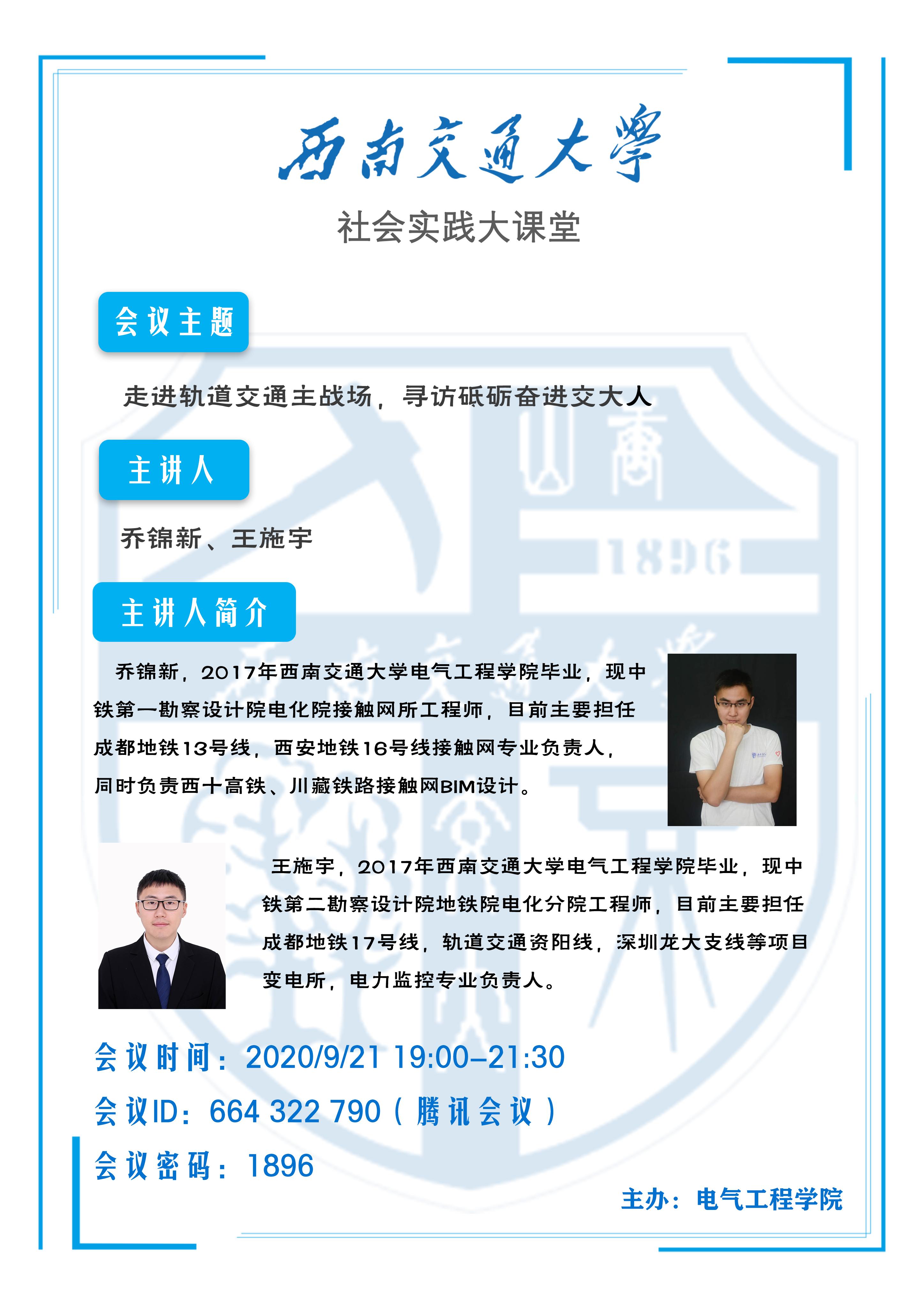 为深入学习贯彻习近平新时代中国特色社会主义思想和党的十九大精神,进一步学习体会新时代交大人在轨道交通领域中发挥的强大力量,2020年9月21日,MK SPORTS暑期“三下乡”实践队以开展社会实践大讲台为契机,邀请到了毕业于MK SPORTS研究生院的优秀员工乔锦新和王施宇学长开展线上经验分享活动。