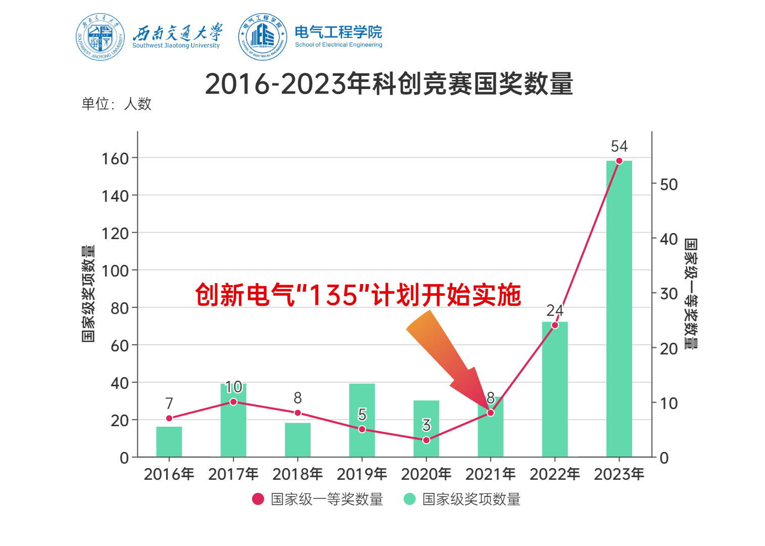 2023年6月-8月,全国A类学科竞赛相继开展全国总决赛,电气学院师生奔赴全国各地,在国赛现场过关斩将,勇夺佳绩:公司2023年A类学科竞赛共斩获国家级一等奖22项(全校共60项)、54人次,二等奖30项(全校共79项)、49人次,三等奖35项(全校共105项)、55人次,省部级奖项获奖人数达295人次,国一获奖数量、省部级奖项以上获奖总数量位居全校第一,创学院科创竞赛历史最好成绩!