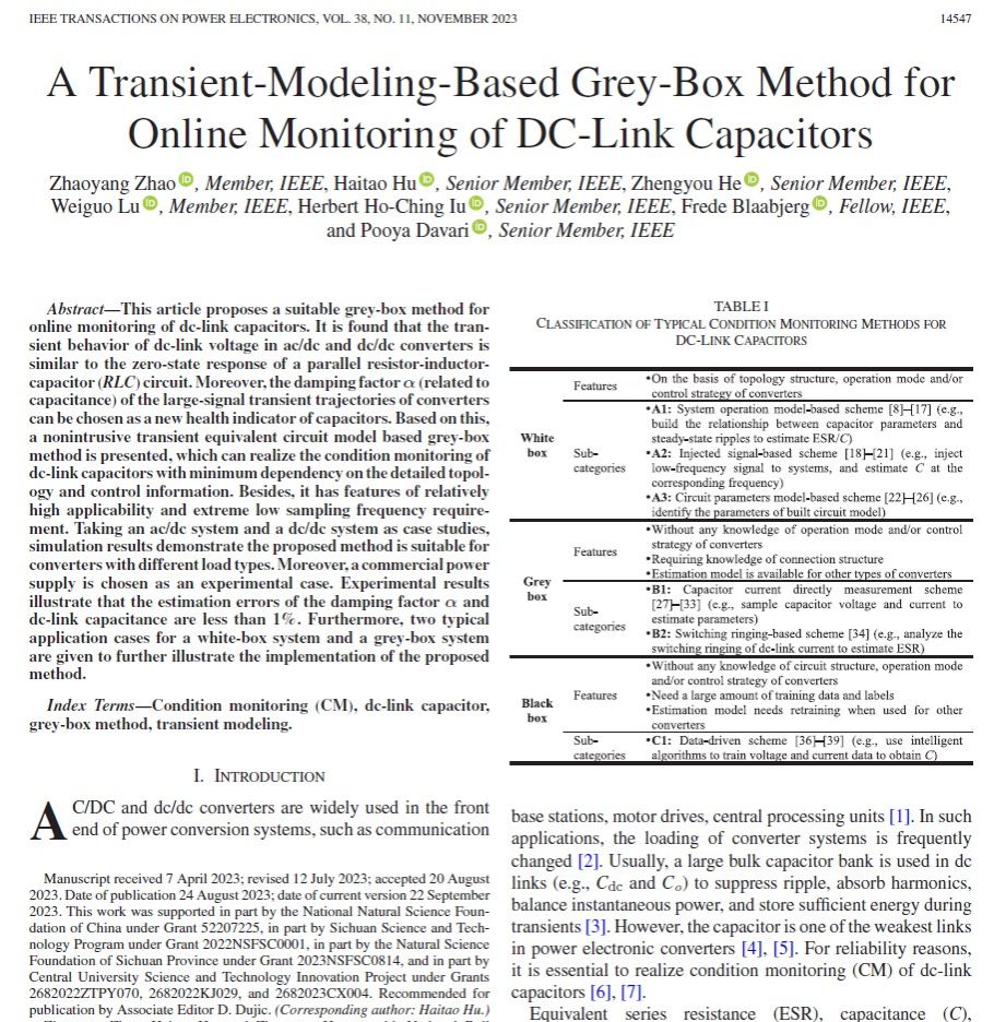 Recently, the IEEE Power Electronics Society (PELS) announced the winners of the 2023 Prize Paper Award for its flagship journal, IEEE Transactions on Power Electronics (TPEL). From the 1,364 papers officially published in the journal in 2023, 5 first place prize papers, 9 second place prize papers and 2 prize letters were selected. The paper "A Transient Modeling-Based Grey-Box Method for Online Monitoring of DC-Link Capacitors" by Prof. He Zhengyou and Prof. Hu Haitao won the second prize of the 2023 Prize Paper Award.