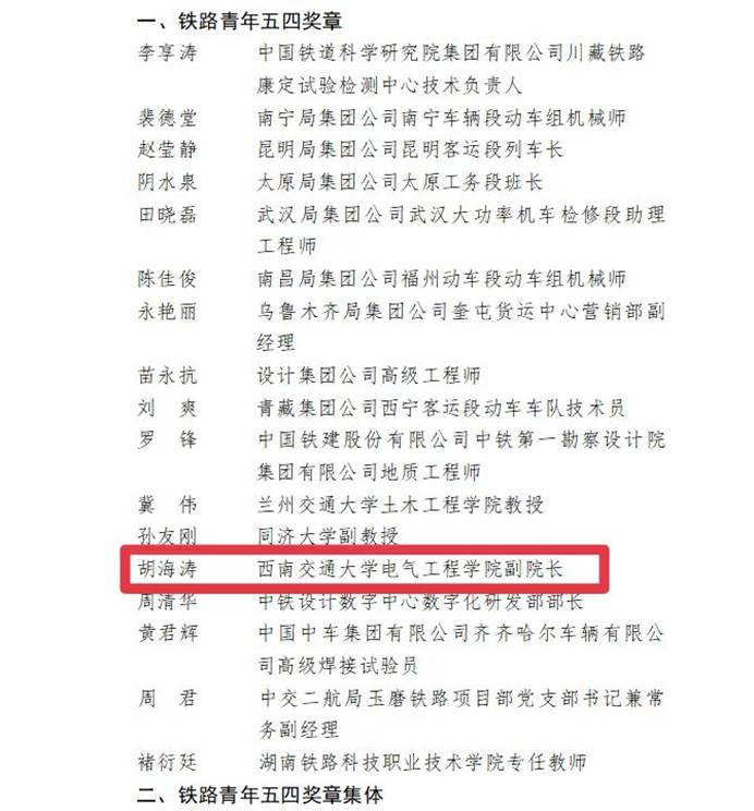 On the occasion of May Fourth Youth Day, Professor Hu Haitao, Vice Dean of the School of Electrical Engineering, was awarded the 21st Railway Youth May Fourth Medal.