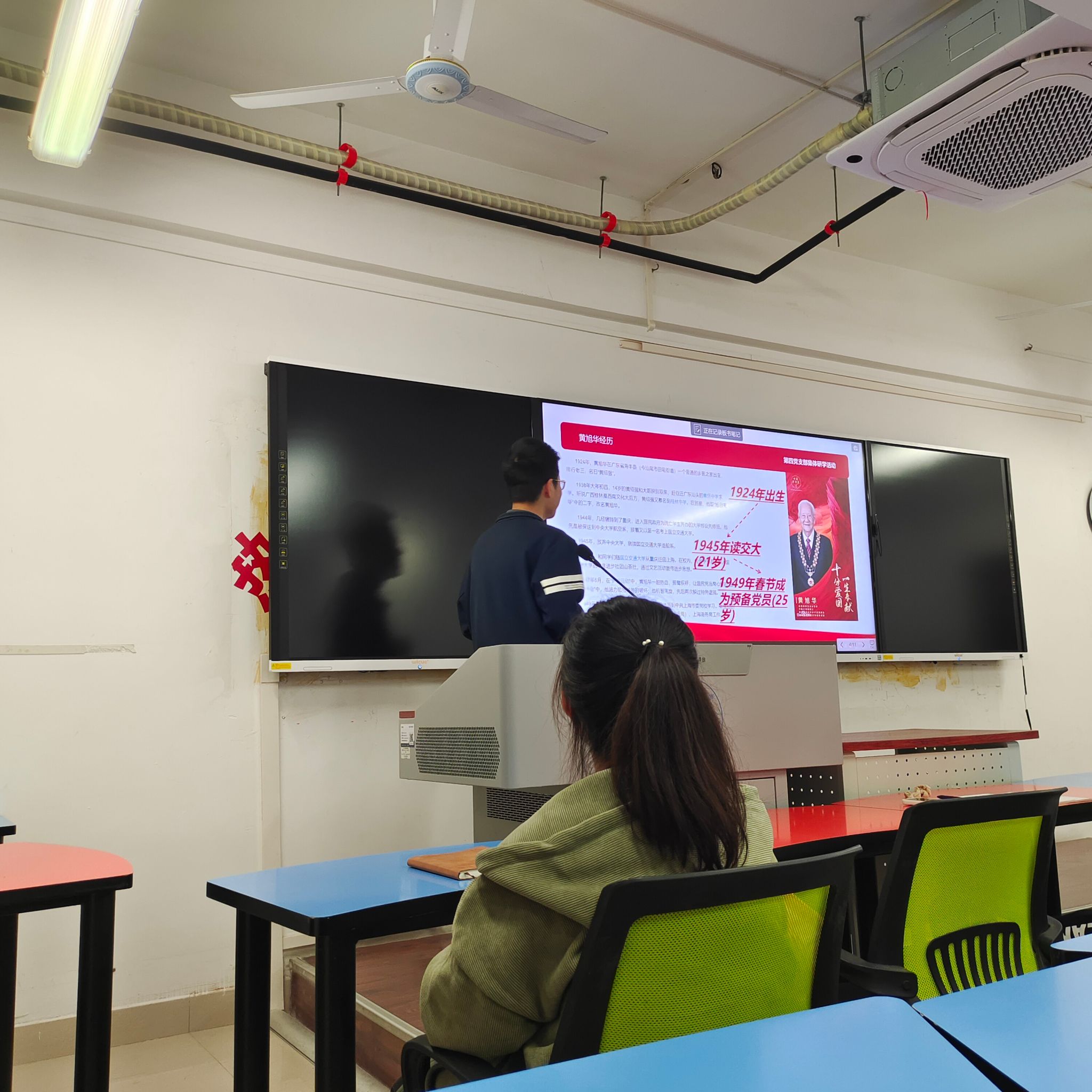 伫立于鲜红的党旗前,电气本科2020级第四党支部书记李连安琪身为领誓人,率领着新老党员们一起握紧右拳,庄严肃穆地回顾了入党誓词。宣誓后,由组织委员许成林带领支部全体成员围绕“共和国勋章”获得者——黄旭华进行研学讨论,结合当前时事等发表自身看法及作为年轻党员可以吸收学习的地方,引导大家共同思考,并在生活中起到党员同志的先锋带头作用。