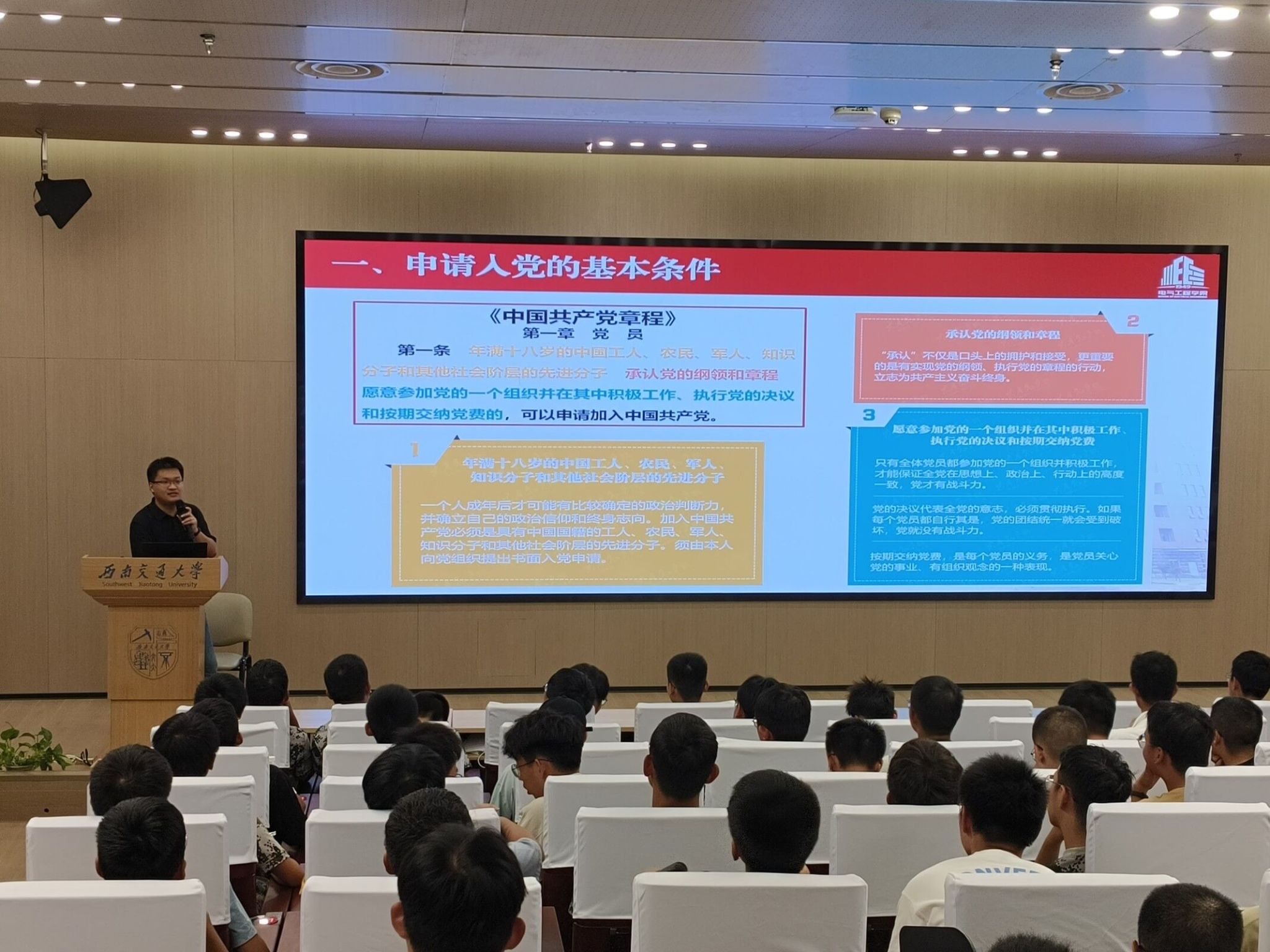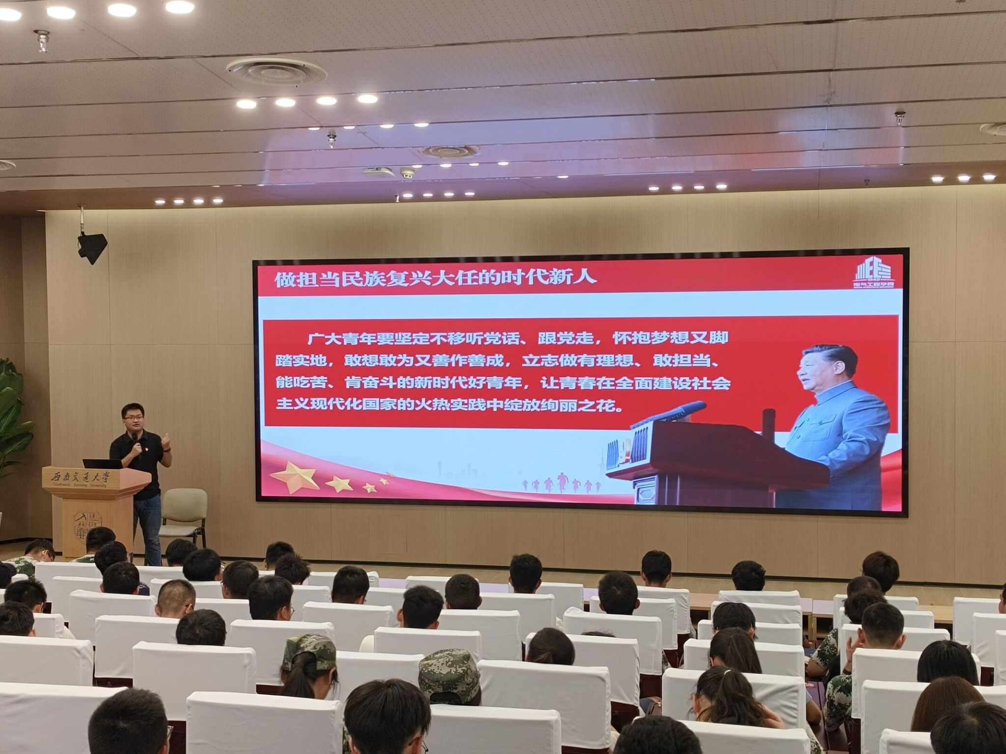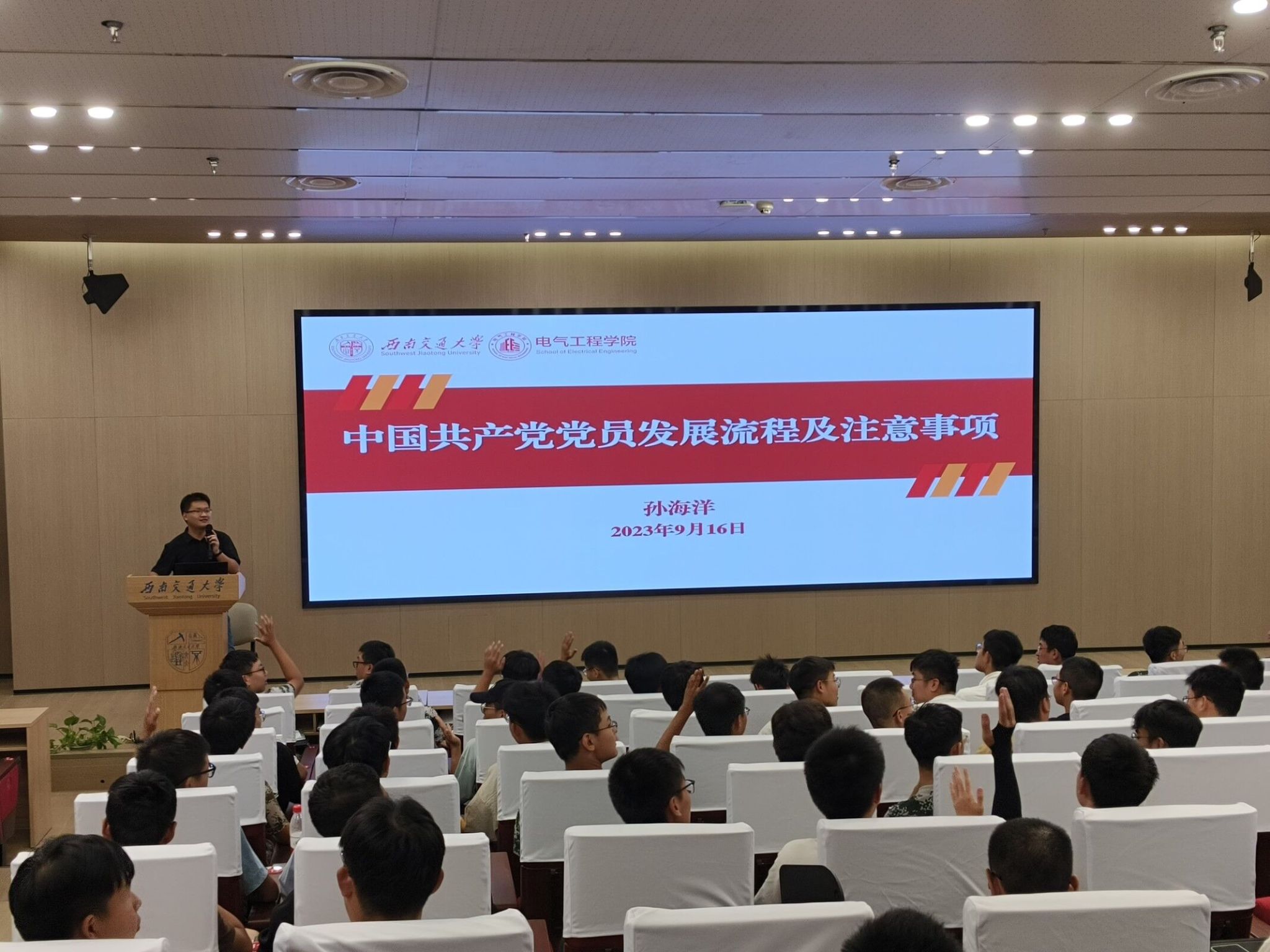 为深入学习贯彻习近平新时代中国特色社会主义思想,落实党的二十大重要精神,2023年9月16日晚上20:00,MK SPORTS本科2023级在mksport体育犀浦校区一号报告厅开展党员发展专题教育讲座。此次讲座由辅导员孙海洋老师主讲,电气学院本科2023级辅导员詹睿、罗霁轩和全体新生参与。