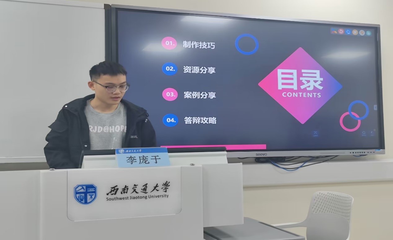 李庞于会长从制作技巧、资源分享、案例分享及答辩攻略四个方面展开培训,并着重强调了制作技巧的重要性。李庞于会长表示,一个制作完好的PPT,不仅可以让讲述人思路清晰,更能吸引观众的注意力,从而引起共鸣。