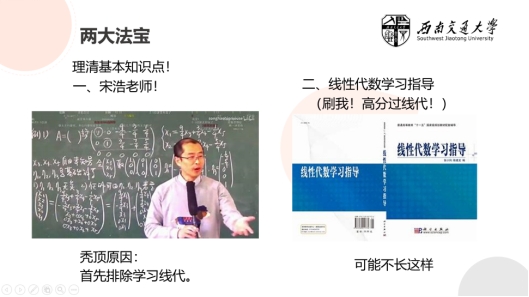 最后,庄严对《线性代数》这门课进行了经验分享,他以自身经历为例,为同学们讲述了自己学习这门课程的心路历程。由于不够重视以及没有矩阵方面的基础,庄严在开始的学习阶段总是跟不上老师的节奏,所以他建议同学们,一定要跟上学习进度,利用课下的时间自学;在做题的角度上《线性代数》并不算很难,只要掌握了化简和变换的方法,大部分问题都能迎刃而解。他为同学们推荐了经典的习题册,并鼓励到:“让你变好的事情,过程都不会是轻松的。”