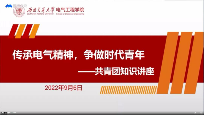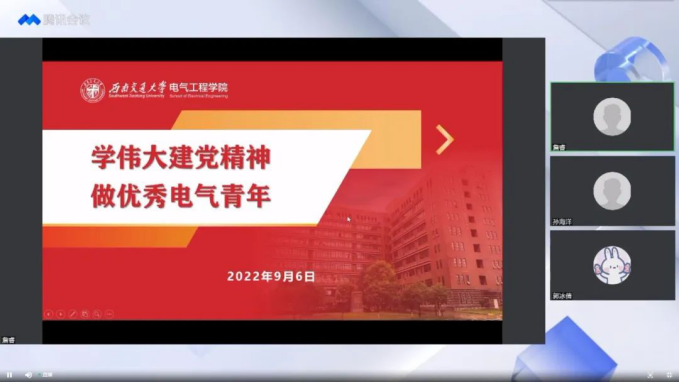 詹睿老师首先从伟大建党精神讲起。一百年前,中国共产党的先驱们用自己的鲜血创建了中国共产党,形成了坚持真理、坚守理想,践行初心、担当使命,不怕牺牲、英勇斗争,对党忠诚、不负人民的伟大“建党精神”,这是中国共产党的精神之源,也是胜利之源。随后,詹老师向同学们提出了作为交大电气新青年的要求:同学们应继承并发扬党的崇高精神,认真学习马克思主义理论和中国特色社会主义理论,将爱国情怀落实到主动为同学服务的实际行动中,以高标准严格要求自己,勇于承担当代青年的历史与社会责任。