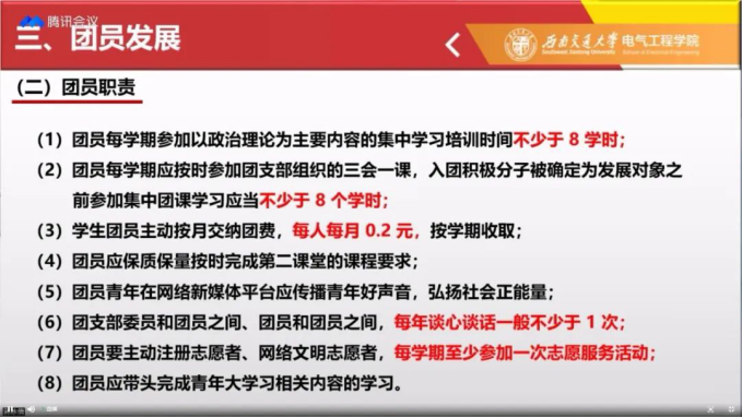 郭冰倩老师还向同学们介绍了共青团员的发展流程,并指出共青团员应该积极参与有关基本政治理论的培训,主动按月交纳团费,在网络新媒体平台应传播青年好声音,弘扬社会正能量。最后,她向同学们介绍了学院的团学组织与活动。