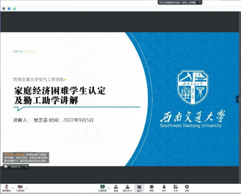 2022年9月5日19时整,电气学院本科2022级召开新生入学教育讲座,本次讲座以线上会议的形式进行,主题为员工资助专题,主讲人为学院资助负责人樊芝菱老师,学校“小资小助宣讲团”成员木荣俊、刘小菲、胡松。辅导员孙海洋及2022级新生参加了本次讲座。