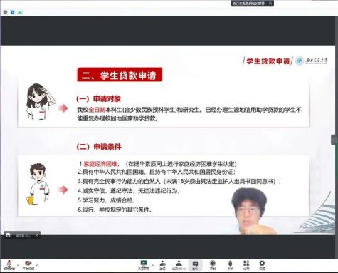 宣讲团胡松讲解了申请助学贷款中的一些细节。胡松从助学贷款申请对象、条件和必备材料说起,向同学们介绍了贷款审批和发放的流程。最后,他提醒同学们应当诚实守信,在毕业后及时还款,避免因为还款逾期而造成不良征信记录,若有特殊情况可向学校和银行申请延期还款。