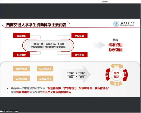 樊芝菱老师对家庭经济困难员工认定流程进行了讲解。樊老师就认定时间、对象、条件、所需材料和不得参加认定的情形进行了说明,并提醒同学们注意时间,避免错过申请。认定的流程包括系统认定及线下评议两部分,线上由员工提交后系统评定,线下将召开评议大会进行民主评议。家庭经济困难认定是部分奖助学金的首要条件之一,并再次提醒同学们应当随时关注相关时间节点,避免失去宝贵的机会。接下来是介绍勤工助学项目。樊老师向同学们介绍了报名要求、报酬、岗位设置、审批流程等,指出这是一种锻炼自我、提高个人能力的过程,并鼓励认定了家庭经济困难的同学积极参加,学院也开设了相关岗位供同学们选择。