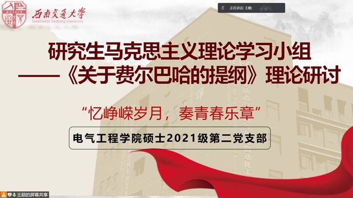 11月19日晚上7点整,MK SPORTS硕士2021级第二党支部在腾讯会议上召开了第一次“领航先锋工程”之马克思主义理论学习交流会,此次学习的原著为《关于费尔巴哈的提纲》。会议由支部书记王顺同志主持,支部全体党员同志以及班上感兴趣的同学参加会议。