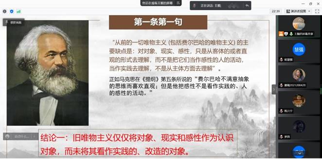其次由杨慧强同志代表第二组对《提纲》第三、第四条进行领读和解读,提出这部分内容主要是批判旧唯物主义关于“人是环境和教育的产物”,阐述人同环境和教育的辩证关系以及评述费尔巴哈的宗教观,阐述宗教产生的根源。第三组的成员依次对《提纲》的第六、第七和第八条进行解读,阐明“全部社会生活在本质上是实践的”, 这是《提纲》实践哲学思想的最重要理论命题之一。最后第四组的成员对《提纲》的第九、第十和第十一条相继进行解读。最后两条作为《提纲》的结论, 阐明了马克思主义的新唯物主义的本质特征和历史使命,指明了马克思主义哲学革命性变革的实质。