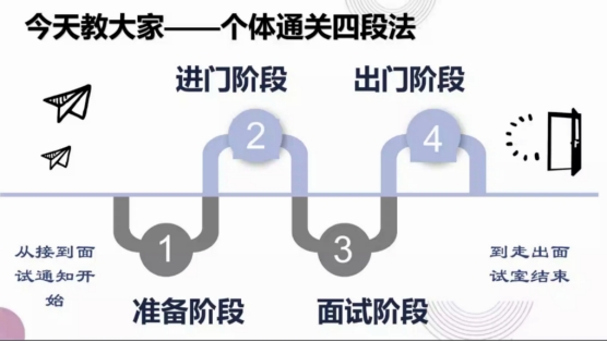 活动开始,梁喻嘉抛出了一个问题:谈到面试你想到了什么?自我介绍、压力测试、推销自己、回答问题、无领导小组讨论……引导同学们去思考面试时会遇到的问题。随后,她从准备阶段、进门阶段、面试阶段和出门阶段详细讲解了面试的个体通关四段法。