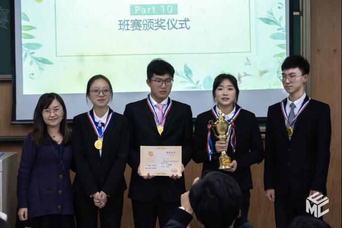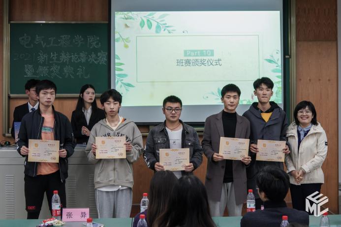 评委选票统计完成后,来自智控2021-04班的反方二辩曾媛媛获得了本场最佳辩手称号,电子2021-03班获得本次新生辩论赛的冠军,智控2021-04班获得亚军,电气2021-02班获得季军。评委老师们为获奖班级颁发证书和冠军奖杯并合影留念。