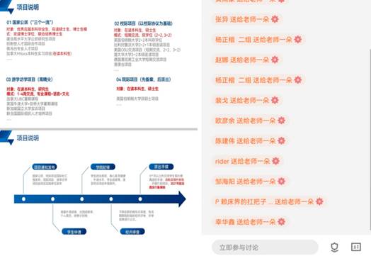 随后,廖莉向同学们介绍了学校出国留学的基本情况和政策,并进行了解读。她接着向同学们说明了公司的国家公派、校际项目、游学访学项目、院际项目四个基本项目并一一进行了深入讲解,让同学们有了深入的了解与认知。同时,她向同学们说明了出国留学的一些注意事项,给同学们留下联系方式,鼓励同学们向她积极提出问题,并且承诺会尽力解决同学们的难题。