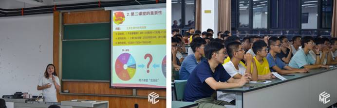 然后,林静英围绕第二课堂展开详细说明。她从第二课堂的定义、重要性、工作思路、分类、基本要求、选课方式等方面,向同学们介绍了第二课堂的基本情况,并希望同学们能够依据相关要求,在毕业前完成第二课堂的学时要求,交出一张漂亮的“第二成绩单”。