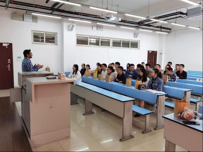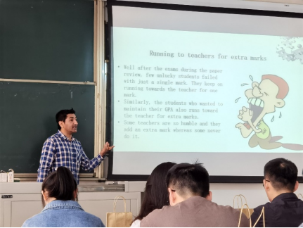 活动开始,Atazaz同学首先进行了自我介绍,并非常热情地和班级同学互动,拉进了与同学们之间的距离。Atazaz同学介绍了巴基斯坦的教育体系,比较了中国和巴基斯坦的教育体系的不同。接着,Atazaz同学分享了自己丰富多彩的老员工活,并例举了一些有趣的故事,引起同学们的共鸣。整个PPT分享环节气氛轻松活泼,同学们也听得津津有味。