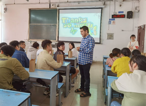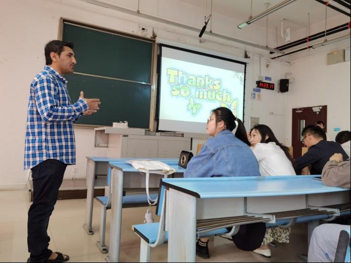 接下来的问答环节,吴雪莲、张曼、龚子和刘新月等同学积极提问。通过问答环节,Atazaz同学介绍了一些家乡的美食和风俗习惯,让同学们对巴基斯坦的文化有了更多的了解。此外,Atazaz同学还分享了自己职工活中遇到的困难,以及解决的办法,表达了自己今后的职业规划。