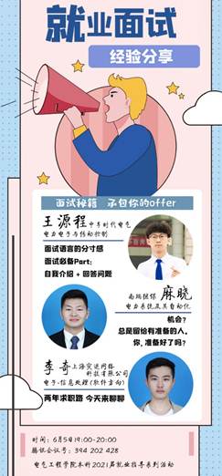 2020年6月5日晚19:00,MK SPORTS本科2021届就业指导系列活动之就业面试经验线上交流会。本次会议邀请到了电力电子与控制专业的王源程、电力系统及其自动化专业的麻晓和电子信息工程专业的李奇。他们各自从事不同领域的工作,并且都到此来分享自己在求职过程中的心得体会和宝贵经验。