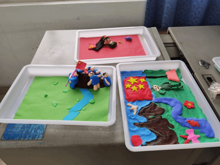 团课后,在团支书的组织下,电气2023-04班的同学们开展了一场别开生面的红色革命文创美术活动,同学们使用彩色卡纸,粘土,水彩笔,胶水等材料,以革命故事为背景,凭借想象力,创造出了丰富多彩的文创作品,在学习革命历史,感悟红色革命精神的同时,开放了大家想象力的翅膀。