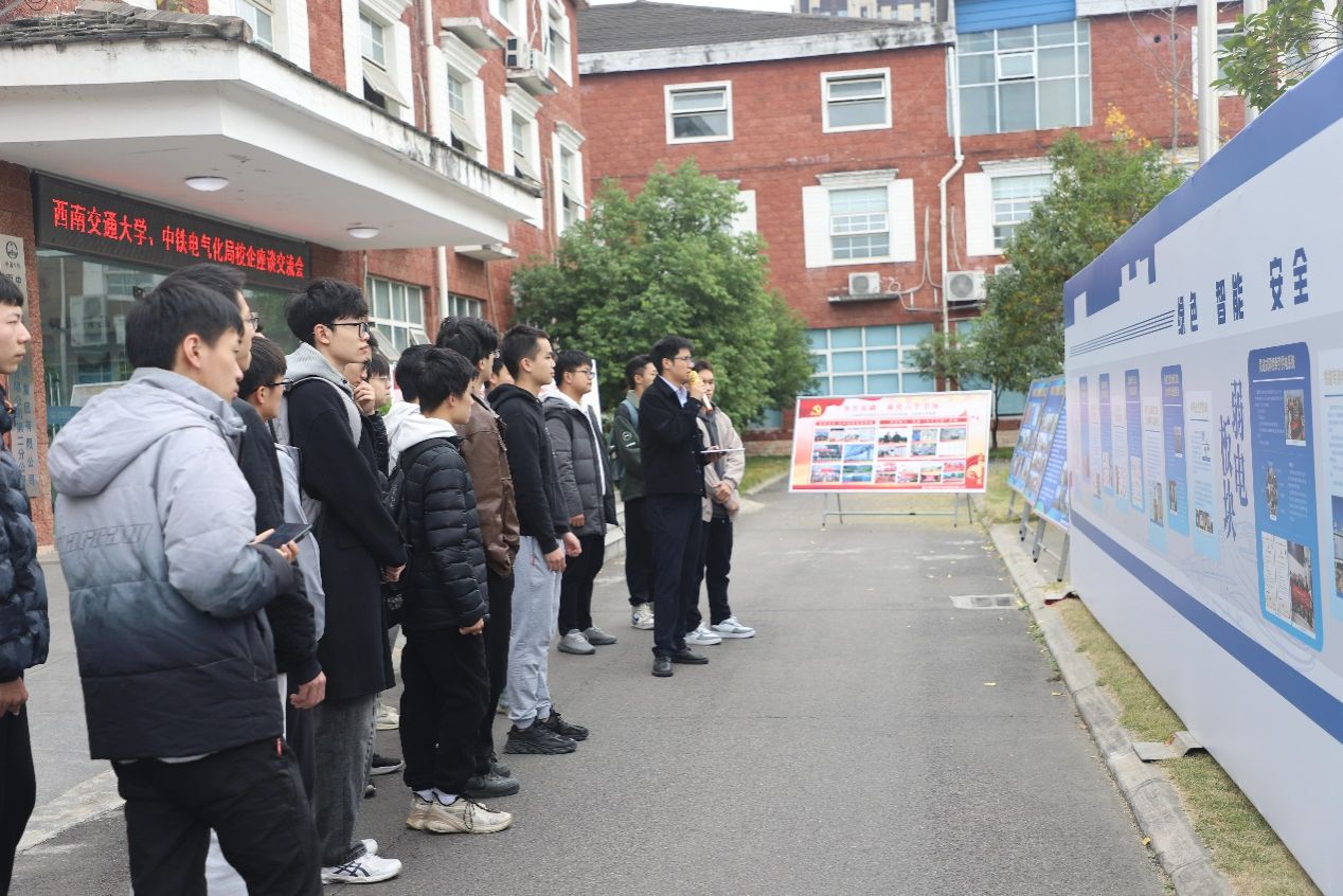 到达项目部后,同学们在中国中铁电气化局成渝中线成都枢纽项目党工委书记窦俊辉的带领下,参观了中铁电气化局西安电化公司关于企业文化、智能建造、项目党建的展板。