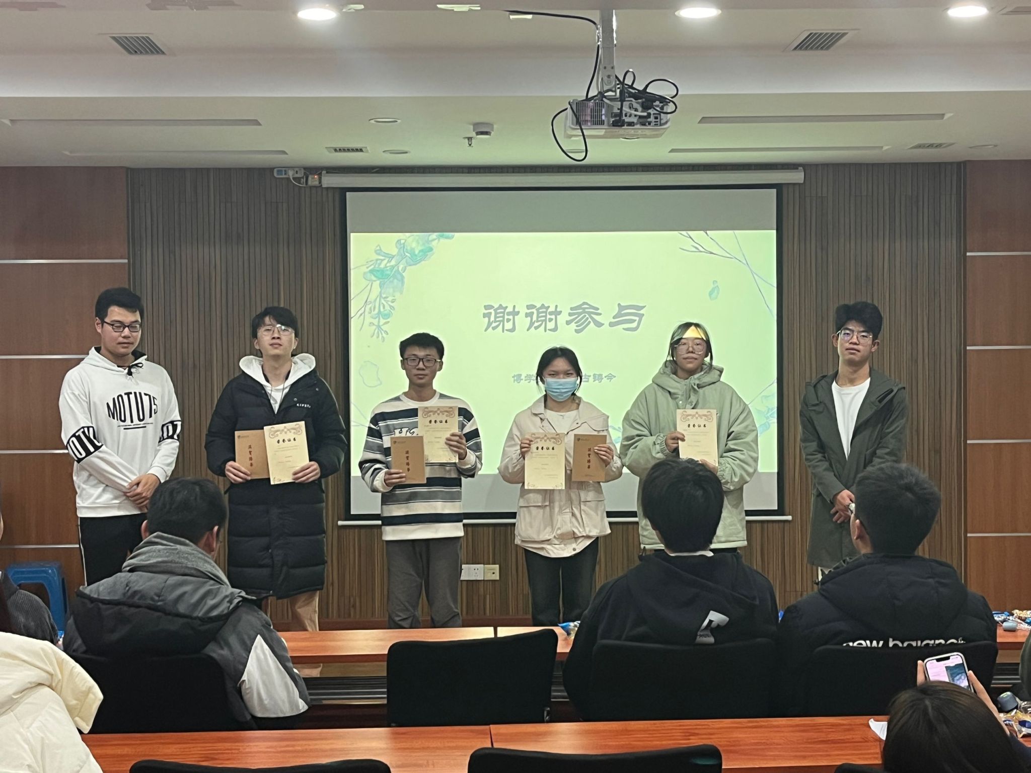 本次活动主要由刘鼎和胡洪林同学负责。刘鼎同学负责现场主持以及物资筹办;胡洪林同学负责本次活动的ppt制作、现场维护等工作。各位同学的轮番上台展示,在分享了书籍的同时也锻炼了自己面对公共场合的勇气与能力。在活动的最后我们对本次分享书籍的优胜组颁发了证书以及奖品,希望能激励他们将读书的好习惯一直保持下去。
