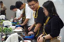 而后同学们三人一组,利用厨师长为大家准备好的食材,亲手烹饪菜肴。略显笨拙的刀法、小心翼翼地倒油……虽然大家的厨艺并不高超,但是热闹的氛围与止不住的欢声笑语展现出了同学们对于烹饪的热情。亲手烹饪的菜哪怕不完美,也依旧是一道意义非凡的美味。