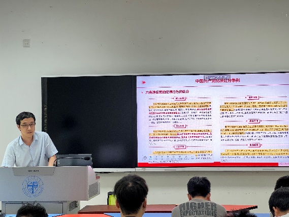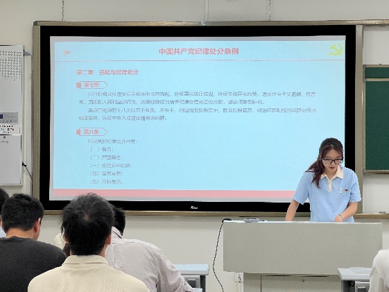 首先党支部成员吴丹同志领学了《条例》的前三章内容,明确了《条例》的制定目的、适用范围、纪律处分的原则和种类。之后党支部成员文翔麟同志领学了《条例》的第四章到第六章内容,涉及到对违法犯罪党员的纪律处分、其他违纪行为的纪律处分以及对违反纪律的党组织的纪律处分,这些内容的落实是规范党员和党组织的行为,维护党的纪律和形象的重要依据。