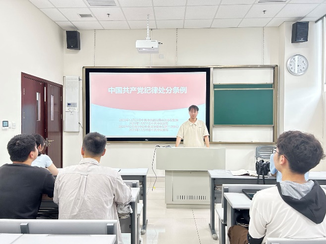 2024年5月17日上午10点,硕士2023级-04班党支部联合硕士2023级-03班党支部在犀浦校区X4133开展《学条例 守纪律 强党性》主题党日活动,主要学习了《条例》的制定背景、重要意义、基本原则,深入领会了党的纪律处分的种类、程序和依据,全面了解了党的纪律要求和对违反纪律行为的处分规定。