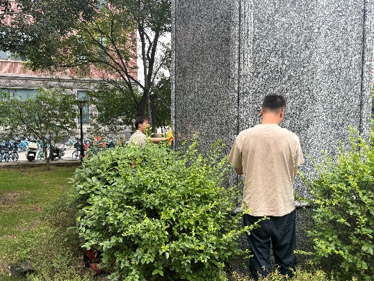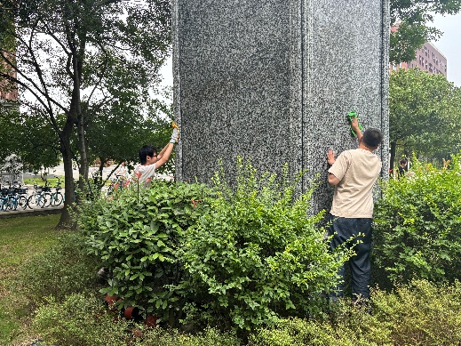 接下来,党支部成员们开始清洁电气馆楼下的雕塑。成员们分工合作,认真擦拭雕塑,有的负责擦拭雕塑的底座,有的负责清洁雕塑的主体部分。在大家的努力下,雕塑表面的灰尘和污垢被清理干净。