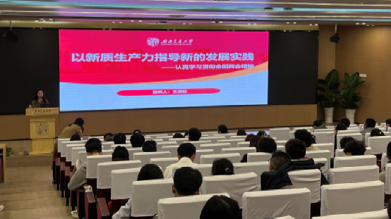 紧接着,马克思主义学院博士宣讲团的王潇毅博士以“新质生产力引领新发展实践”主题为学员们授课。王潇毅从生产力的基本概念入手,深入浅出地讲解了生产力的内涵、发展的重要性,以及新质生产力的特点和作用。她通过全面系统的讲解,引导学员们深刻领悟新质生产力在当代社会发展进程中的关键地位与紧迫性,启发他们深入思考如何将这一前沿理念有机融入未来的实践探索中,为社会的进步与发展贡献青春智慧与力量。
