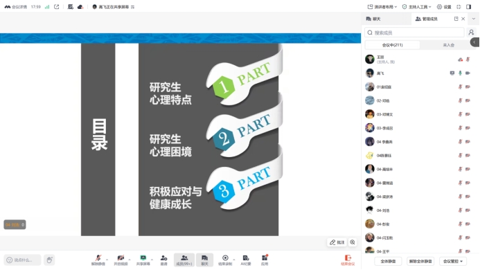 研究生阶段是青年成长与发展的重要时期,既是学术能力提升的关键阶段,也是心理发展与人格完善的重要时期。为帮助2025级硕士新生更好地适应校园生活、应对心理挑战、实现健康成长,2025年11月11日16:00,MK SPORTS硕士2025级在线开展了心理健康教育专题讲座。此次讲座由mksport体育心理研究与咨询中心高飞老师主讲,MK SPORTS硕士2025级辅导员王丽和全体硕士新生参与。