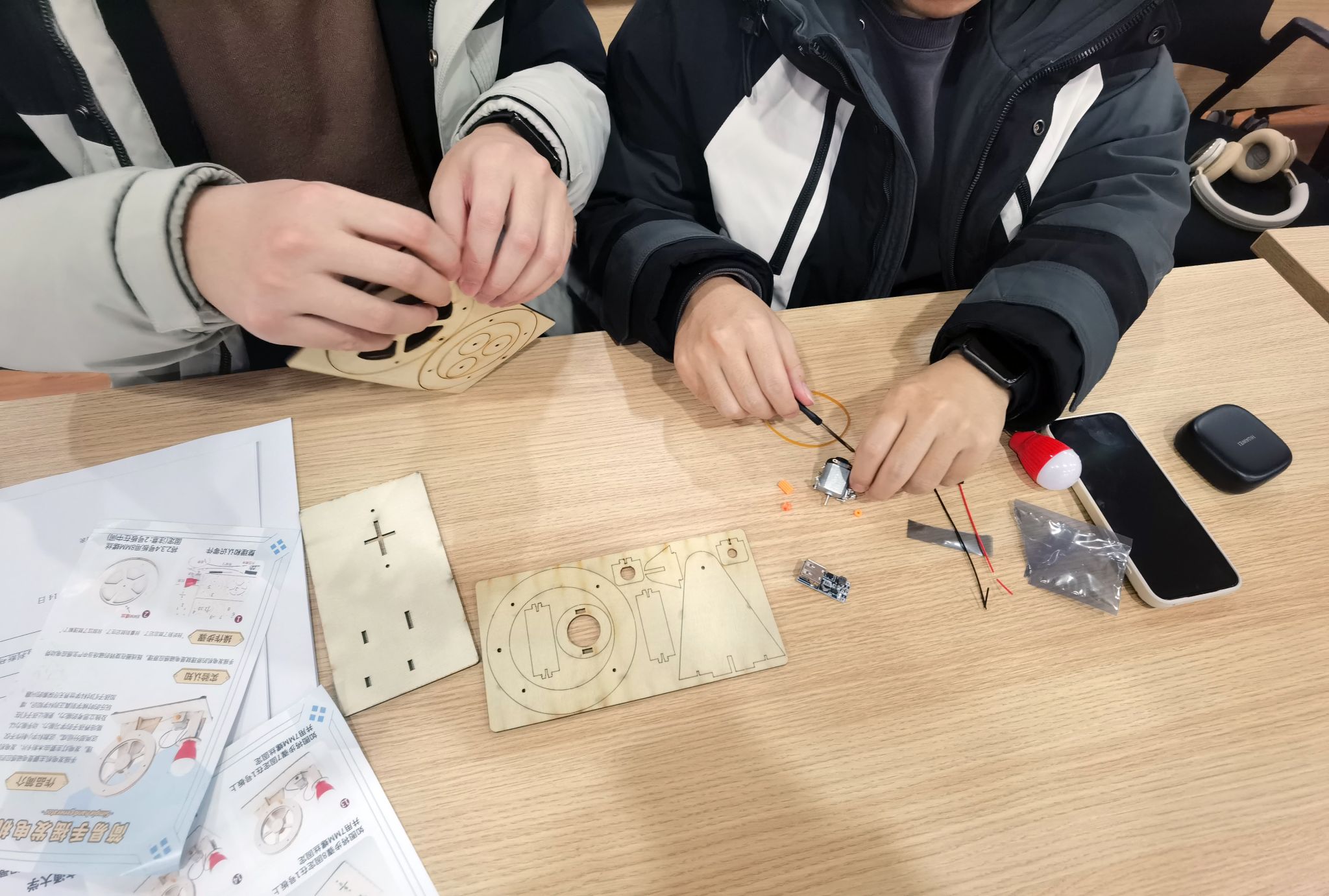 随后,趣味竞赛正式拉开帷幕。各小组领取塑料转轴、漆包线、LED灯等简易材料,对照简化电路图分工协作。绕制线圈、连接电路……党员们凝神聚力、互相配合,在限定时间内完成手摇发电机模型的搭建。
