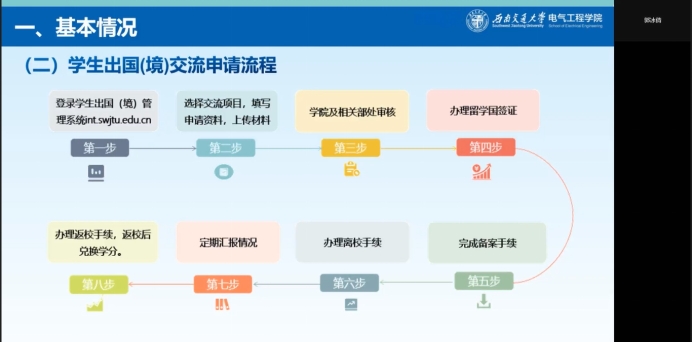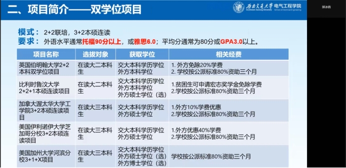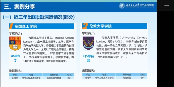 会上,郭冰倩对员工出国(境)留学相关的情况进行介绍。首先她介绍了出国(境)的基本情况,对于申请条件,她强调要有一定的GPA和外语能力,并且做好申请理由的陈述;同时要关注申请流程,不能落下每一步;关于员工出国(境)留学的经费资助,学院也根据实际情况提供了不同程度的资助;关于留学语言成绩转化,学院也实行了相应的制度,为员工成功出国(境)留学保驾护航。接着,郭冰倩对员工出国(境)交流项目做了简介,其中包含:国家公派项目、双学位项目、短期交流项目、游学访学项目、线上项目。随后郭冰倩还分享了员工出国(境)留学成功案例,分别介绍了帝国理工学院、伦敦大学学院、南洋理工大学、爱丁堡大学等18所世界名校,并附上近年来留学成功同学的GPA以供学习借鉴。最后,郭冰倩提供了留学相关问题咨询的联系方式,在线下可以到犀浦校区综合楼423办公室进行详细咨询,也可电话联系学校相关工作人员进一步了解;在线上可以访问国家留学基金委、国际合作与交流处等网站深入了解。