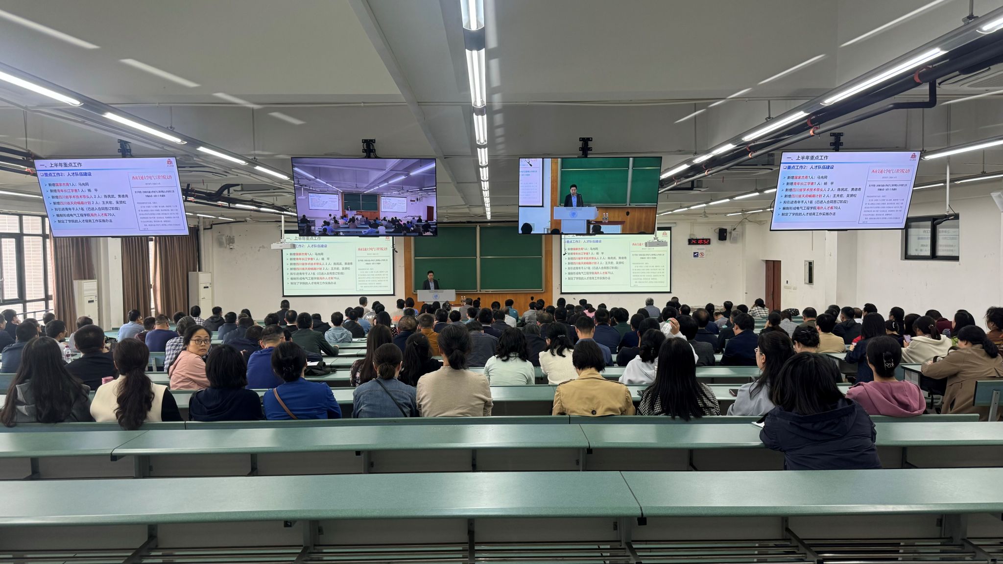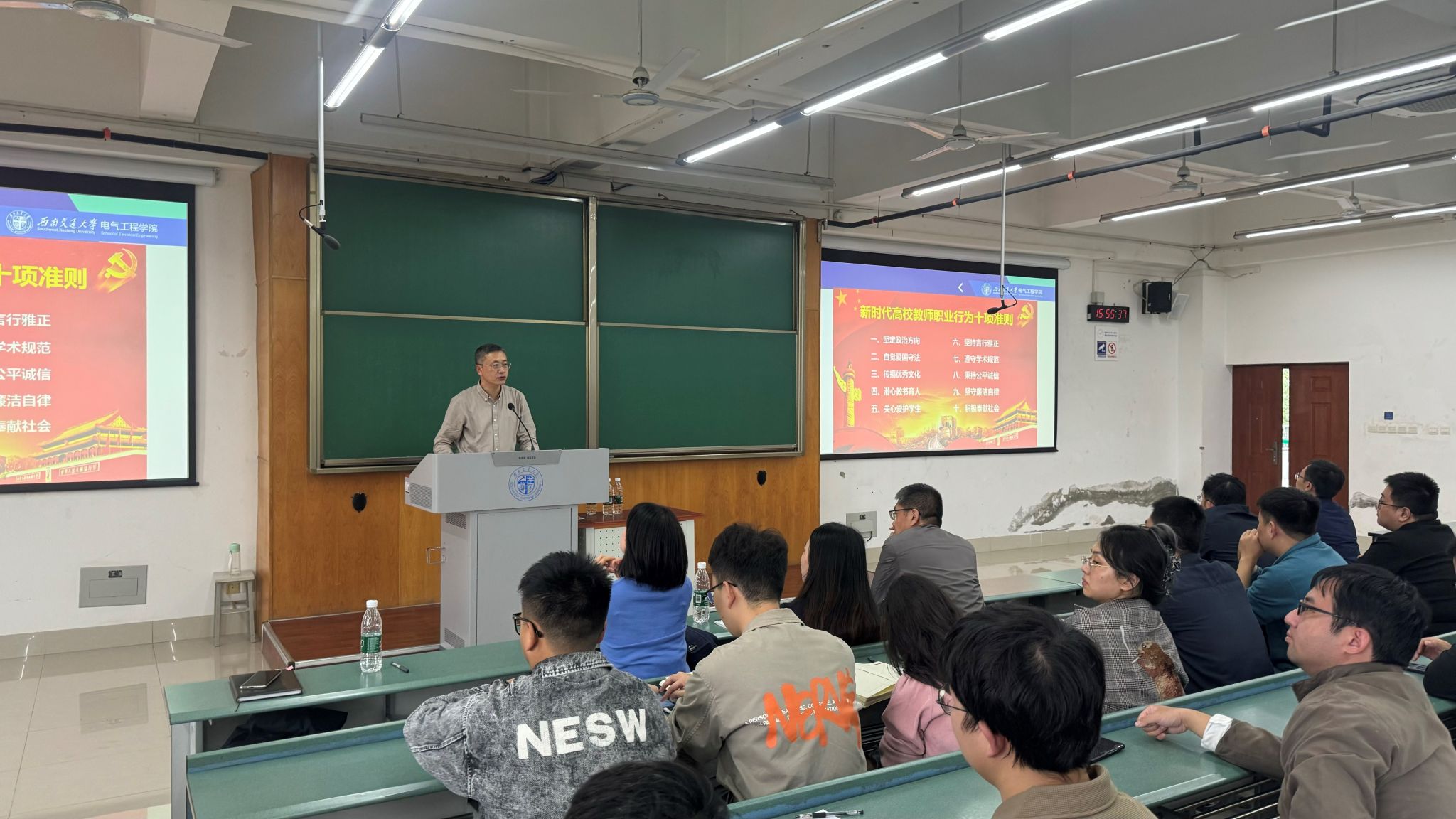 王斌向教职工专题宣讲了全国教育大会精神、《新时代高校教师职业行为十项准则》、教师师德失范行为负面清单、意识形态工作、保密工作及安全稳定工作内容。王斌强调,全院师生要深刻学习领会全国教育大会精神和习近平总书记对教育的重要论述,各位教职工要严格遵守高校教师职业行为十项准则,大力弘扬教育家精神,严格要求自己,恪尽职守、教书育人,把立德树人的根本任务扛在肩上、落在实处。
