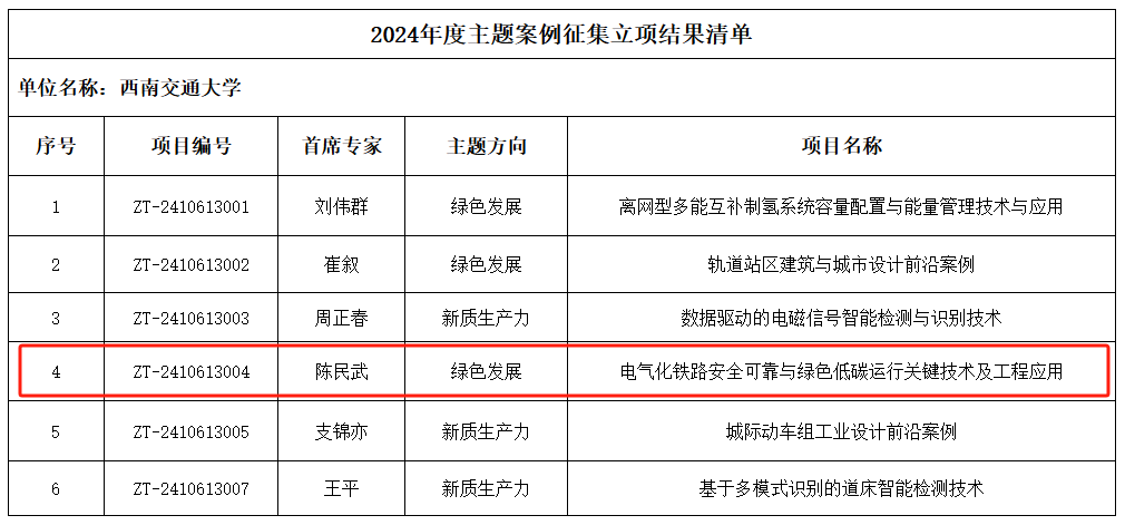 近日,教育部学位与研究生教育发展中心公布了2024年度主题案例立项结果,公司共有6项主题案例成功获批。其中,公司陈民武教授担任首席专家申报的《电气化铁路安全可靠与绿色低碳运行关键技术及工程应用》(项目编号:ZT-2410613004)成功获批。