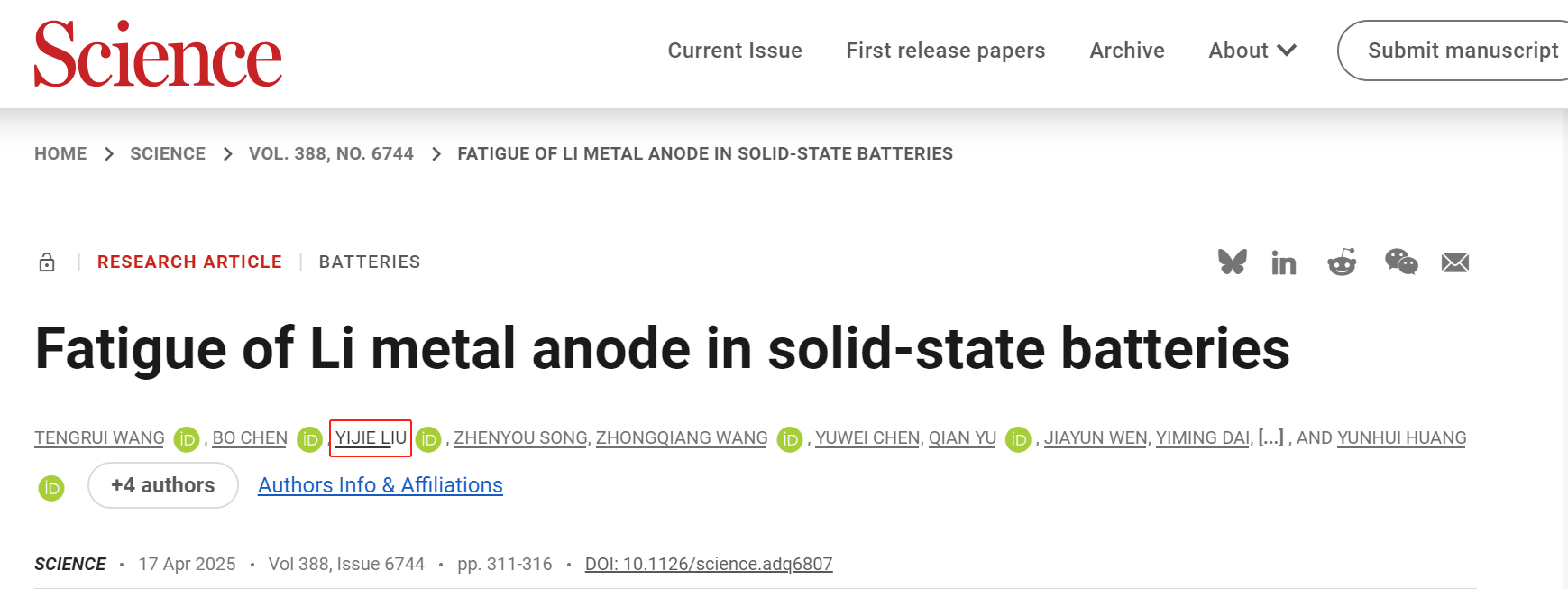 北京时间4月18日,国际顶级学术期刊Science在线发表了MK SPORTS刘毅杰助理教授为共同第一作者的文章“Fatigue of Li metal anode in solid-state batteries”。该成果是电气工程、化学、材料、力学等多学科的深度交叉融合,由mksport体育吴广宁教授团队、同济大学罗巍教授和华中科技大学黄云辉教授团队等合作完成。