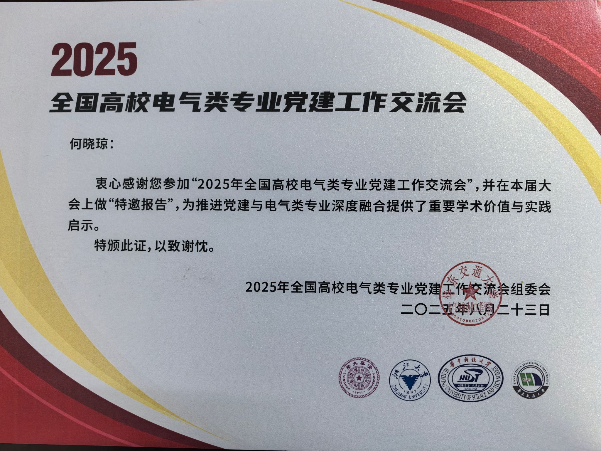 2025年8月23-24日,全国高校电气类党建双创协同平台成立大会暨电气专业党支部书记双带头人能力提升论坛在江西南昌召开。国家轨道交通电气化与自动化工程技术研究中心党支部书记何晓琼受邀参会,并做大会特邀报告。公司党委副书记王轶、电力工程系教师党支部书记刘炜同时参会。