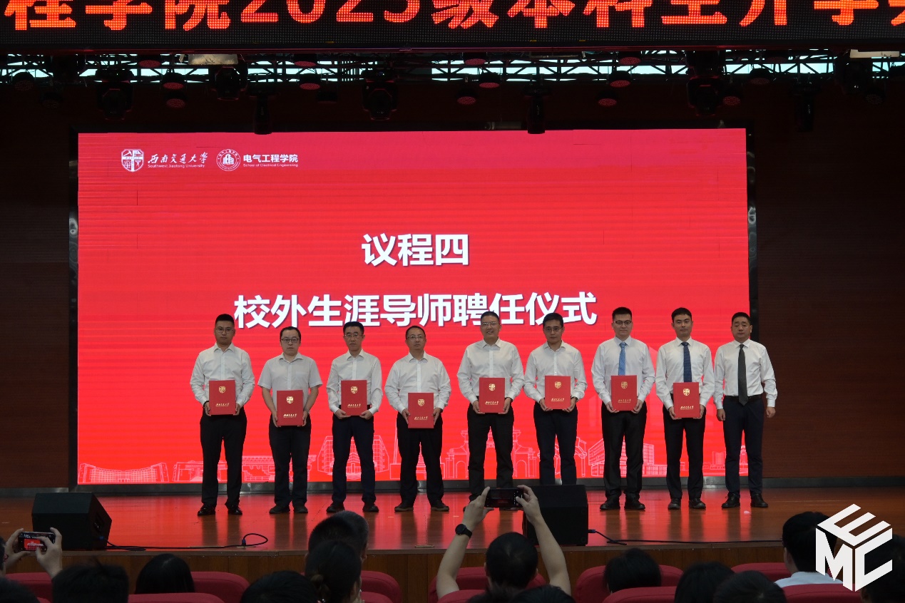 典礼上,马光同经理为他们颁发聘书:电气1班校外生涯导师陈世浩(中铁二院工程集团有限责任公司机动公司党总支书记、经理)、电气2班校外生涯导师吕玮(南京南瑞继保电气有限公司研究院部门经理)、电气3班校外生涯导师樊东(国家电网有限公司西南分部高级专责)、电气4班校外生涯导师王成杰(乐山市委组织部研究室副主任)、电气5班校外生涯导师侯黎明(中国铁路设计集团有限公司机环院机辆所所长)、电气6班校外生涯导师金沧海(中铁武汉电气化局集团有限公司党建工作部副部长、机关党委副书记、纪委书记,工会主席)、电气9班校外生涯导师杨佳(中铁二院工程集团有限责任公司电化院副总工程师)、电气12班校外生涯导师王利军(中铁二院工程集团有限责任公司机动院总工程师)。这些来自各行各业的专家翘楚将成为同学们老员工涯中不可或缺的“引路人”。