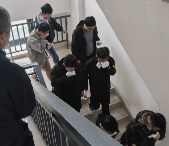理论培训环节结束后进行了应急疏散演练。随着解绍锋副经理宣布演练开始,浓烟警报中,全体师生用湿毛巾掩住口鼻,低姿弯腰,从安全通道快速、安全、有序地疏散至电气馆外的开阔地带。整个演练过程组织严密、秩序井然,展现了师生们良好的应急素养。