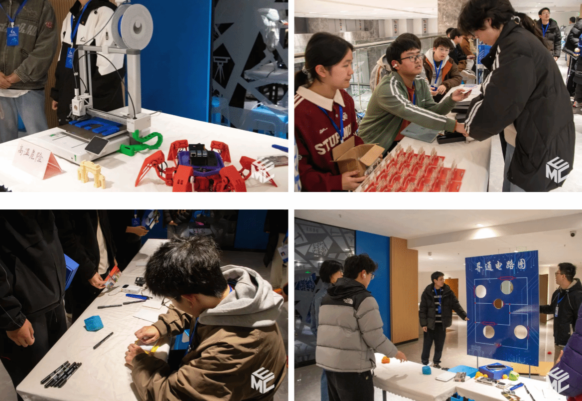 大会前后,学院还在现场组织了一场别开生面的科创集市。活动现场不仅设置了多个科创作品展位,集中展示了多项斩获国家级奖项的优秀作品与国家级科创项目成果,还推出了趣味十足的科创互动小游戏,为现场增添了浓厚的科创趣味氛围。活动特别设置了集章兑换环节,在展位完成互动任务后即可收集印章兑换定制科创纪念品。