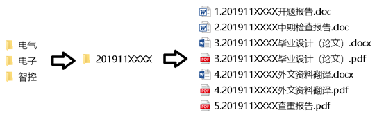 以完整学号命名文件夹,文件夹内含开题报告、中期检查报告、毕业设计(论文)(需提交word版本和pdf版本)、外文资料翻译(需提交word版本和pdf版本)和查重报告。