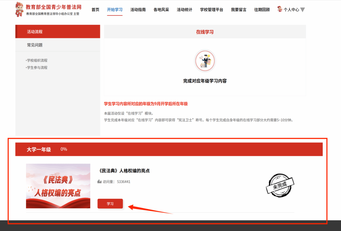 本次学习以年级、班级为单位,统一在教育部全国青少年普法网上开展,各班级应积极组织同学利用平台资源完成在线学习、成果检测等,并于2025年10月26日之前完成平台学习全覆盖。